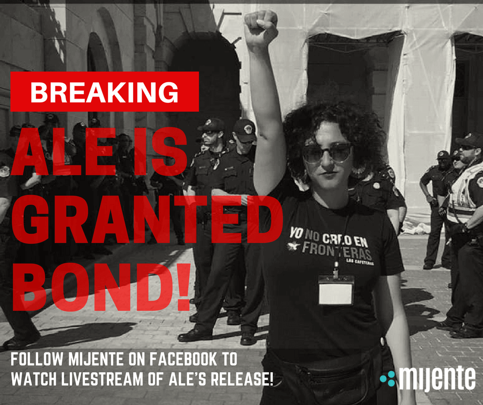In addition, Alejandra and her legal counsel will also be defending her against the arrest made by the Department of Homeland Security (DHS) during a protest in Virginia, which is responsible for Alejandra’s current detention, which goes to trial in Virginia May 15th.